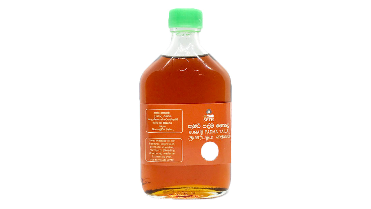 Kumari Padma TailaAuthentic Massage oils used in various massage treatments. To be used for External Use only. Use for insomnia, depression, psychotic disorders, headache, smarting eyes and nose bleeding.