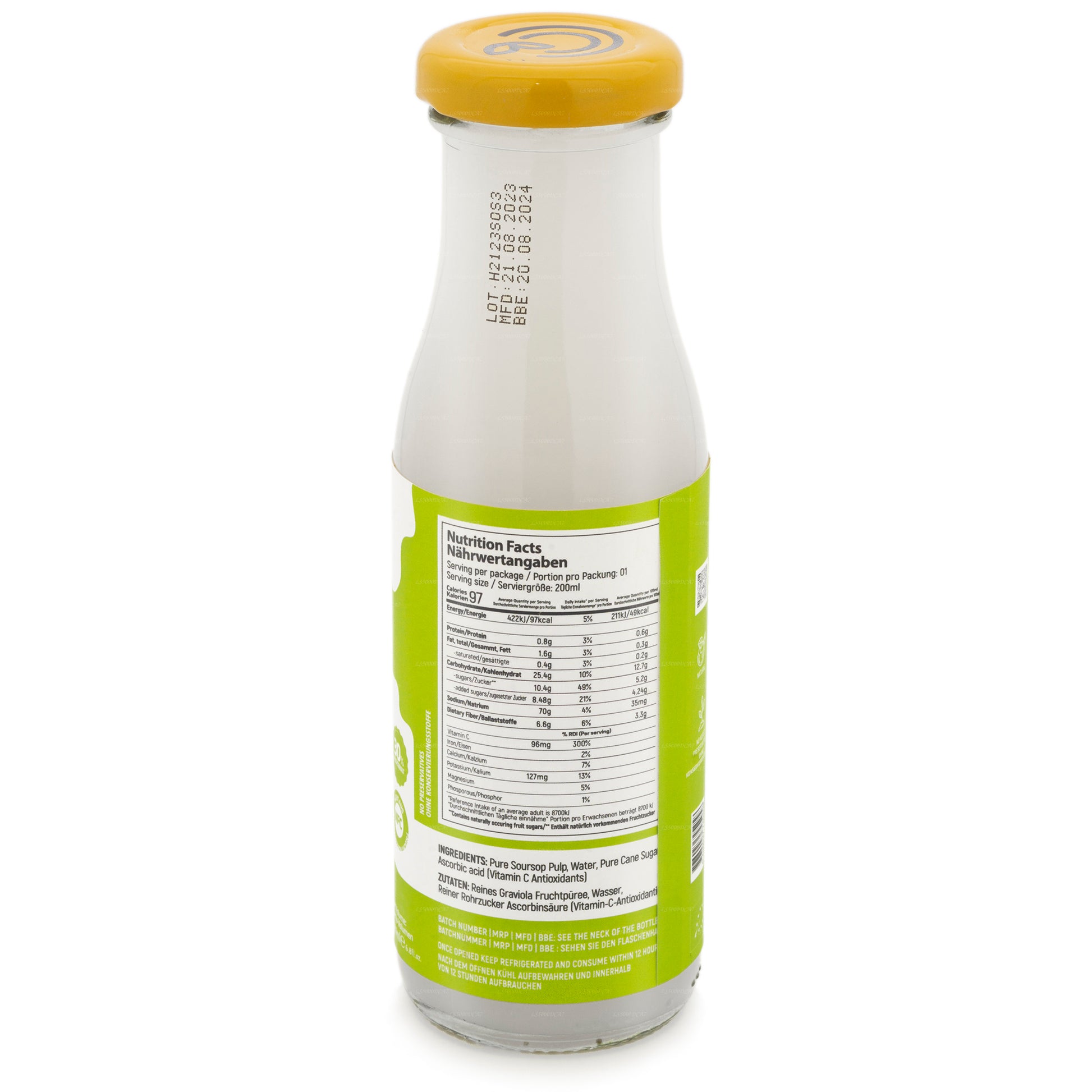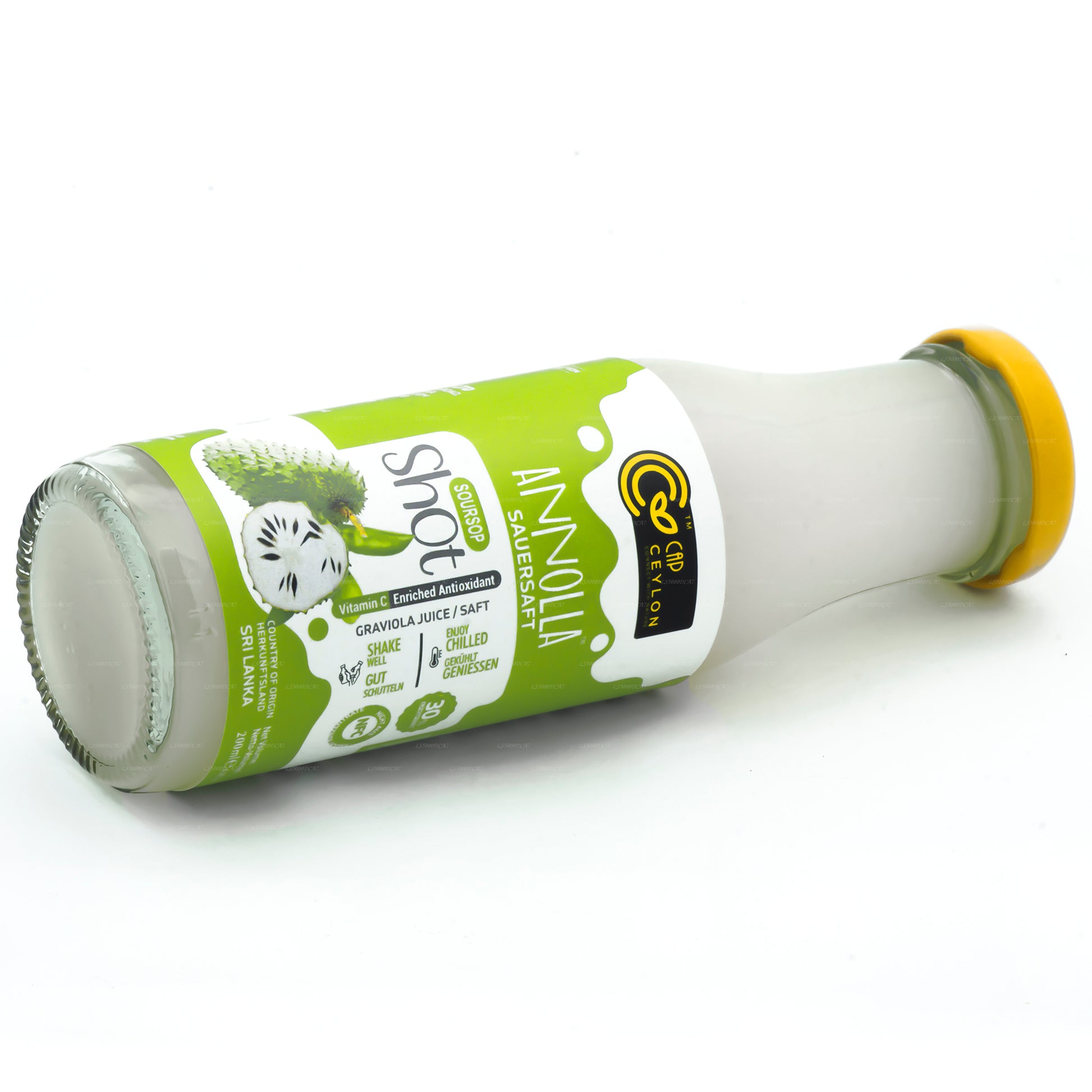(SKU: LS5000DCA7) CAP Ceylon Soursop Shot Made from 100% natural Soursop Drink. Comes in a 200ml glass bottle with Safety Metal Lid. Sugar with pasteurization, No preservatives used and has a shelf life of 12 months.