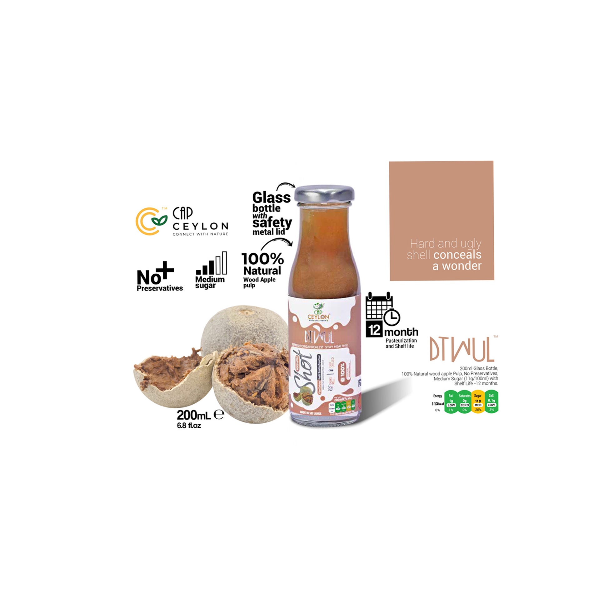 CAP Ceylon Wood Apple Shot (200ml) je zdravý tropický nápoj vyrobený ze 100% přírodní dřevní jablečné buničiny, pečlivě zabalený ve skleněné láhvi s bezpečnostním kovovým víkem. Se středním obsahem cukru pro vyváženou sladkost a absolutně bez přidaných konzervačních látek je tento výživný nápoj pasterizován, aby zajistil 12měsíční trvanlivost při zachování jeho autentické chuti. CAP Ceylon Wood Apple Shot, bohatý na přírodní dobroty, nabízí jedinečnou pikantní chuť a osvěžující podporu, což z něj činí ideální volbu pro zdravotně uvědomělé jedince, kteří hledají chuť i wellness