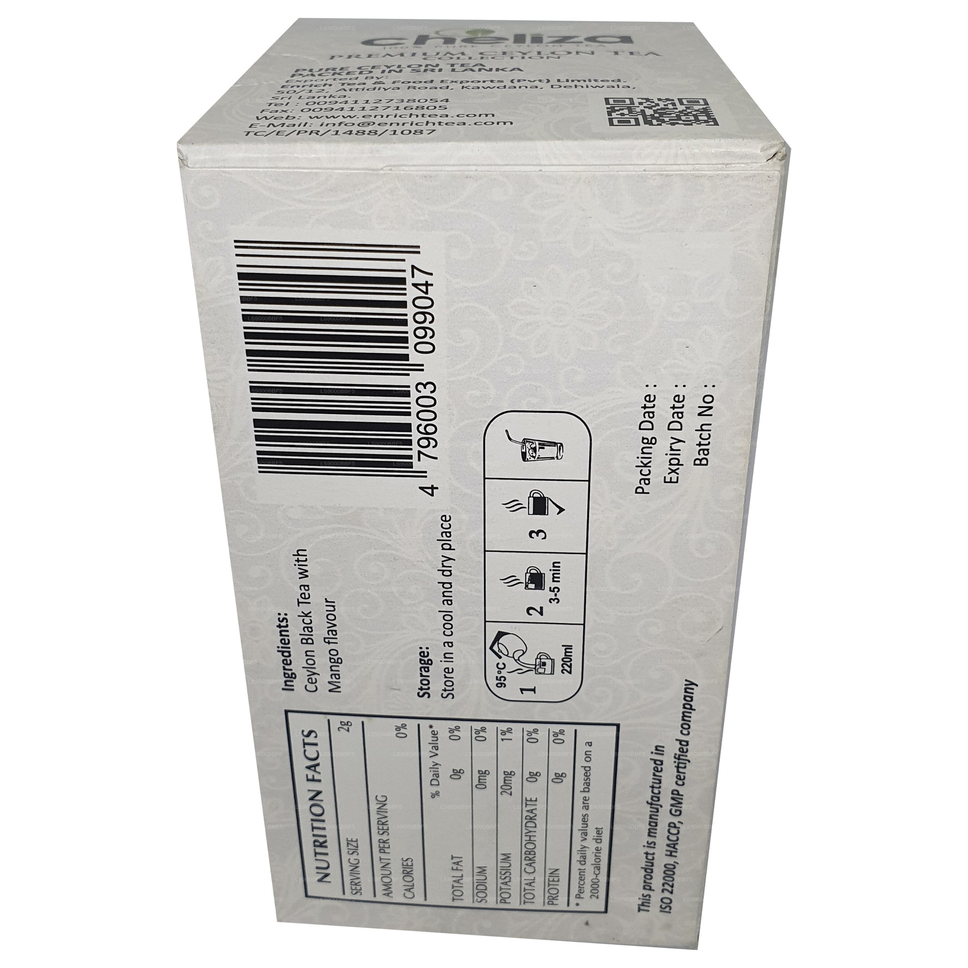 Cheliza Ceylon Black Tea with Mango Flavour (50g) 25 Tea Bags combines the boldness of Ceylon black tea with the sweet, tropical notes of mango, offering a rich and aromatic tea experience. Ideal for both hot and iced tea, this unique blend delivers a refreshing and flavorful cup, perfect for any time of day. With 25 tea bags in each pack, it’s a versatile and delightful choice for tea lovers seeking a fruity twist on traditional black tea.