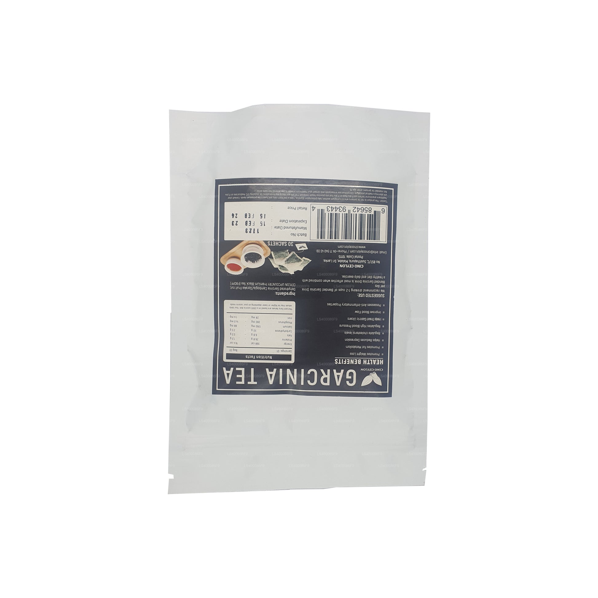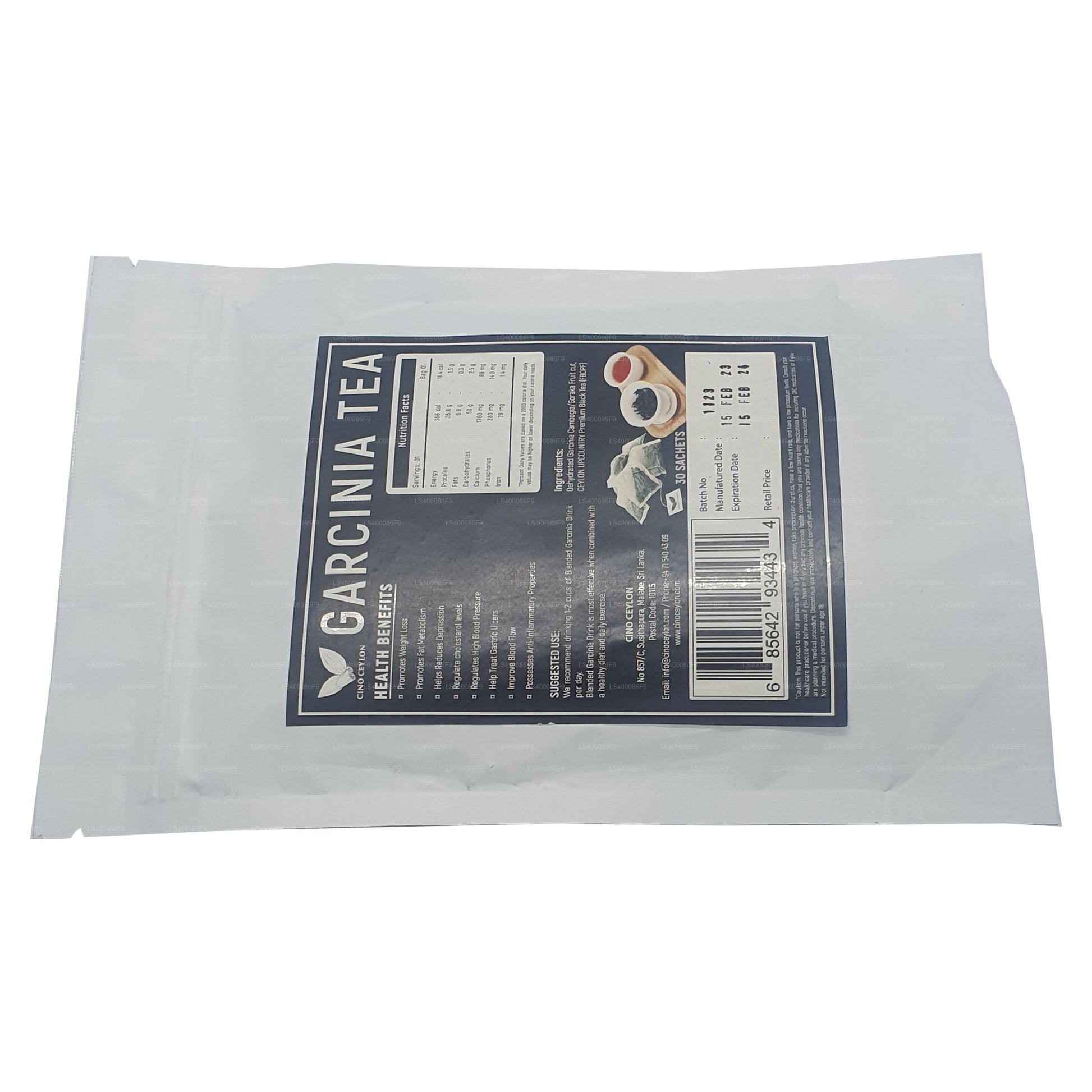 (SKU: LS400086F9) Cino Ceylon Garcinia Tea: Unikátní směs ceylonského čaje a Garcinia Cambogia ve 30 praktických čajových sáčcích. Bez kofeinu, potenciálně pomáhá při regulaci hmotnosti. Nabízí osvěžující chuť s náznaky ceylonského čaje a Garcinia Cambogia. Pochází z renomovaných ceylonských čajových plantáží a poskytuje univerzální a snadno připravitelný nápoj. Užijte si lahodný a potenciálně zdravý šálek čaje s každou porcí