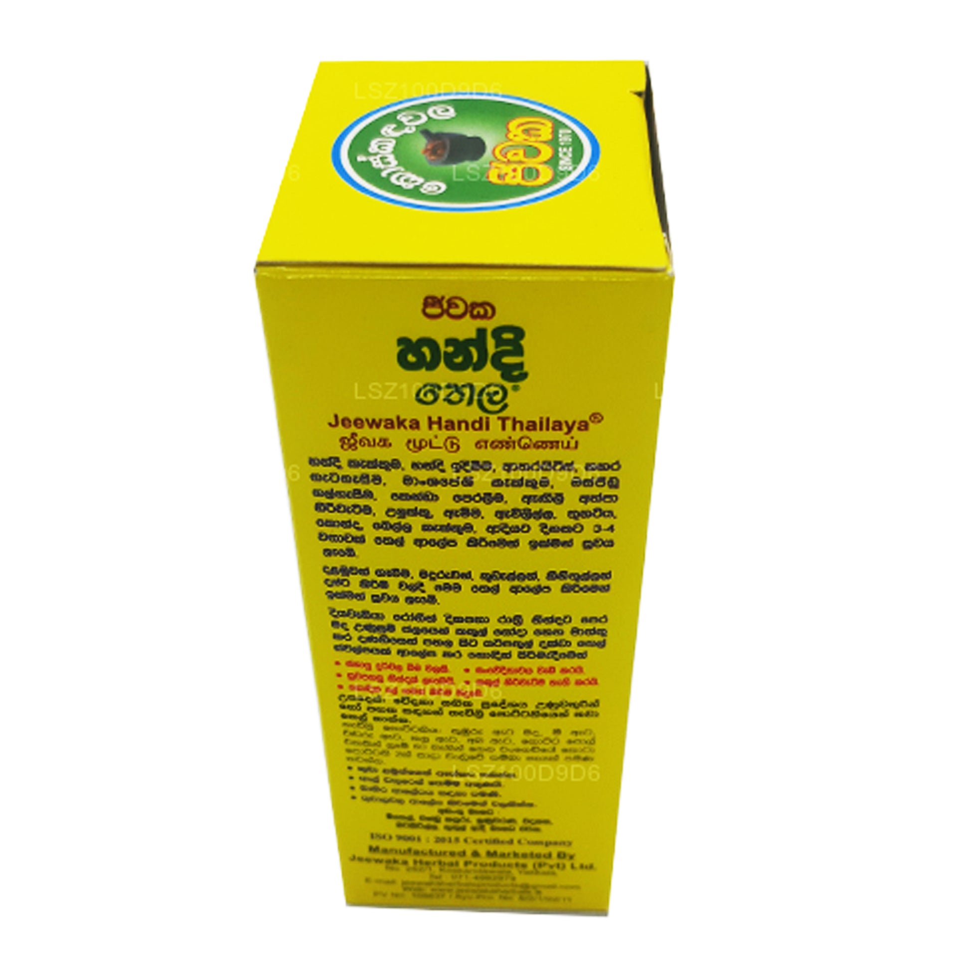 Koskandawala Jeewaka Handi Thel je prémiový, zcela přírodní bylinný olej vyrobený z kombinace tradičních srílanských ingrediencí, navržený tak, aby poskytoval uklidňující úlevu pro tělo i mysl. Tato 100ml lahvička nabízí silnou formuli, ideální pro masáž unavených svalů, zmírnění napětí a zlepšení prokrvení. Díky svým terapeutickým vlastnostem pomáhá zmírnit stres, bolesti svalů a únavu.