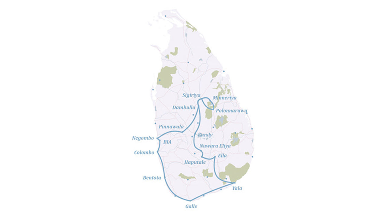 This tour takes you through Sri Lanka to discover some of the marvels and hidden treasures it has in store. Travel from Negombo to Sigiriya to venerate, explore and to witness some of the man made structures, temples, monasteries, statues that still speak volumes of a rich heritage. Visit the ancient cities of Dambulla, Polonnaruwa, Sigiriya and Kandy and be in awe of the traditions and culture that they display. Go on a spice tour and enjoy a train journey up to the highlands of Nuwara Eliya and explore the beautiful city. Trek amidst the mountain terrains of Ella and enjoy safaris at Yala and Minneriya. Visit Galle and spend time by the beach. Explore the Fort and the buildings.