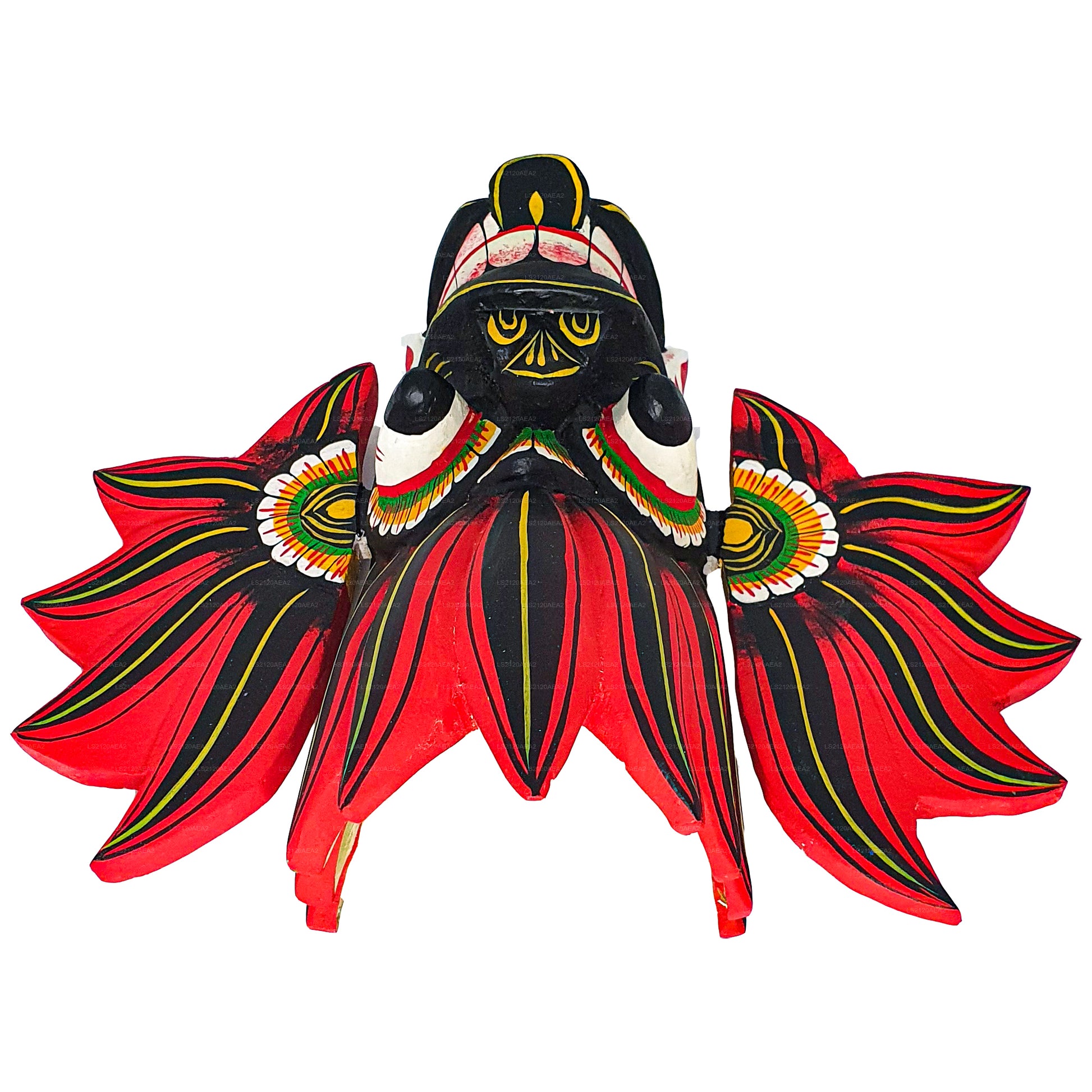 The "Raksha" mask is a traditional mask from Sri Lanka, often used in traditional dance performances and rituals. It represents a demon character with bulging eyes, protruding tongue, and fearsome expressions. These masks play a significant role in Sri Lankan culture, symbolizing protection against evil spirits and bringing blessings to the community.