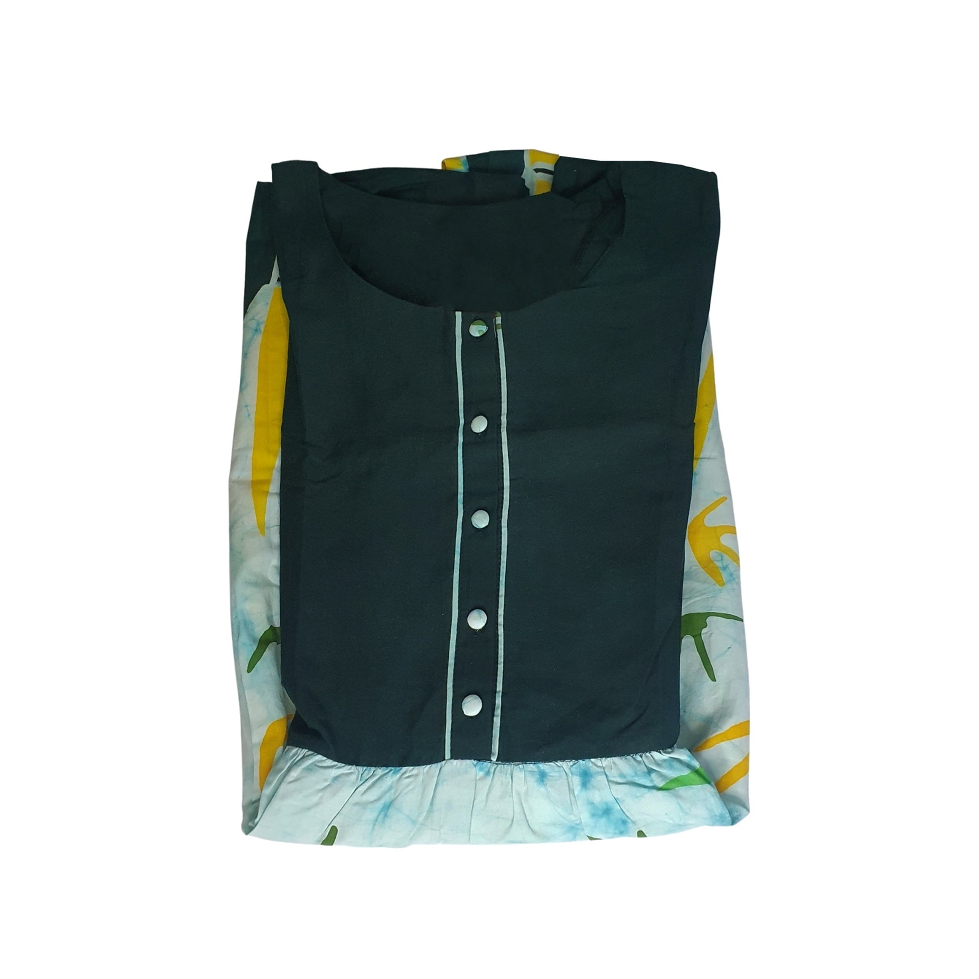A modern patterned long batik frock, exquisitely designed in a multicolors. Both the front and backsides of the frock are designed with the same batik pattern.