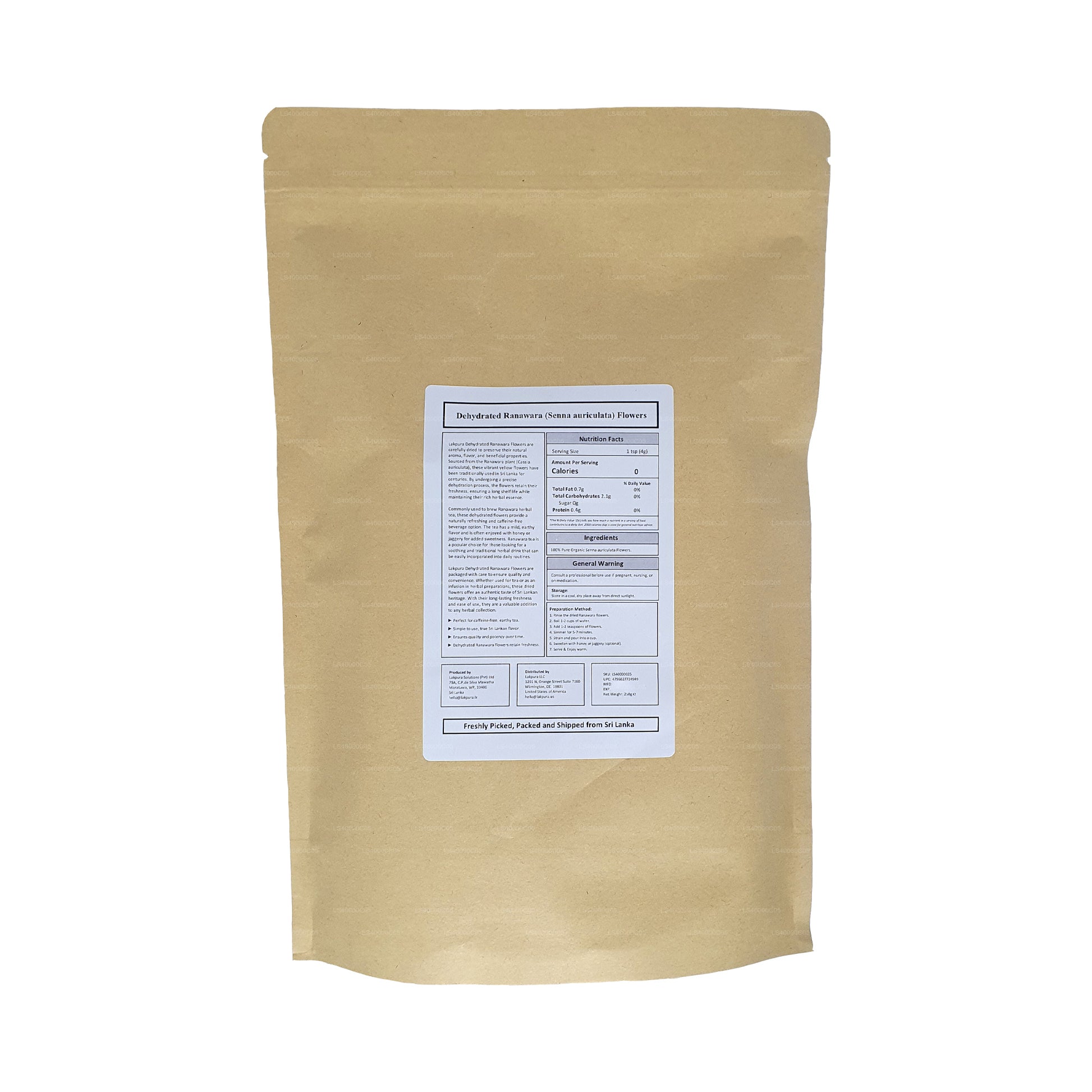 Known among locals as Ranawara and scientifically as Cassia auriculata, it is a much-branched shrub with yellow flowers and darker veins. The Ranawara plant has been a herbal remedy for centuries and is used for various ailments as well as a remedy to enhance a clear skin complexion. Our Ranawara flowers have been collected by homegrown and small-scale farmers and packed under hygienic conditions while the dehydrating process is done under low temperatures to ensure all their natural nutrients are unharmed and intact.