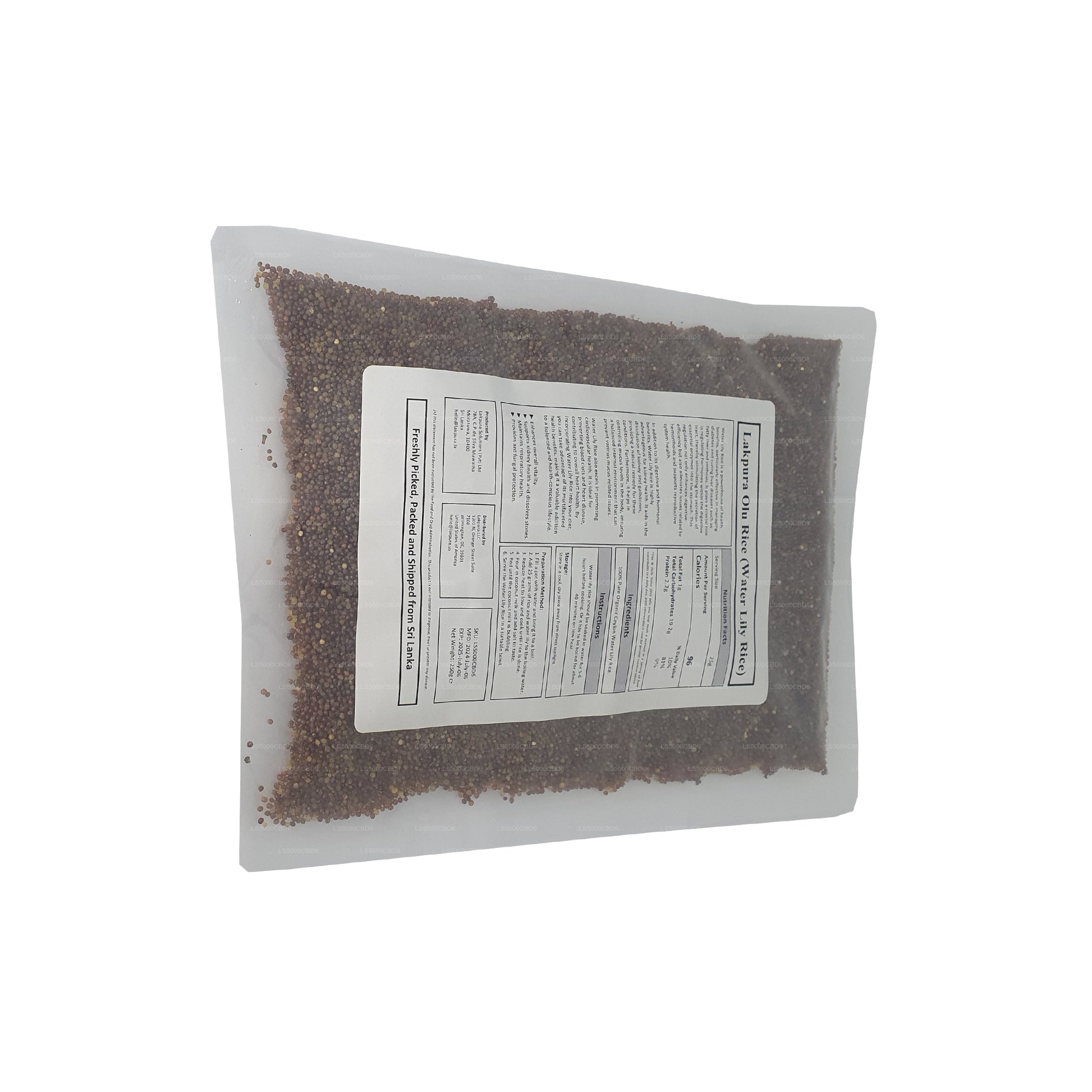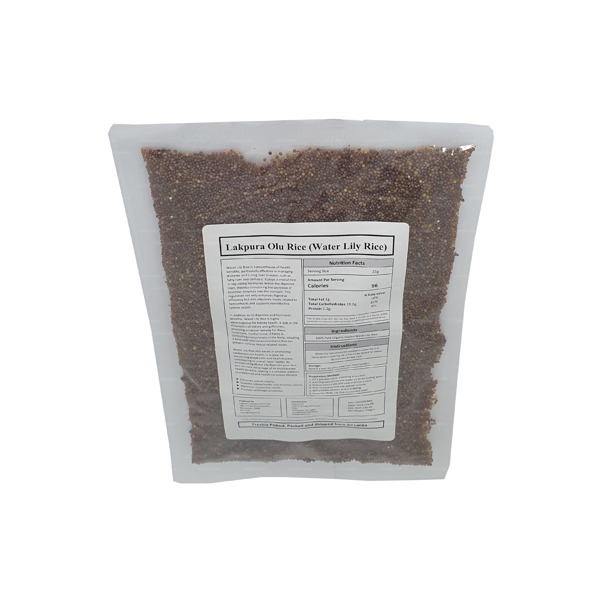 Leknínová rýže nebo běžněji známá jako rýže Olu se sklízí přímo z plodů zralých leknínů nebo Olu Mal, jak to Srí Lančané označují. Konzumuje se hlavně jako náhrada rýže, zatímco lidé si ji užívají také jako směs kaše díky svým léčivým a nutričním vlastnostem. Tato konkrétní rýže Olu je ideální pro ty, kteří musí omezit konzumaci sacharidů. Tento produkt je vyroben ze 100% semen leknínu a je ideální pro nasměrování vašeho životního stylu na zdravější verzi.