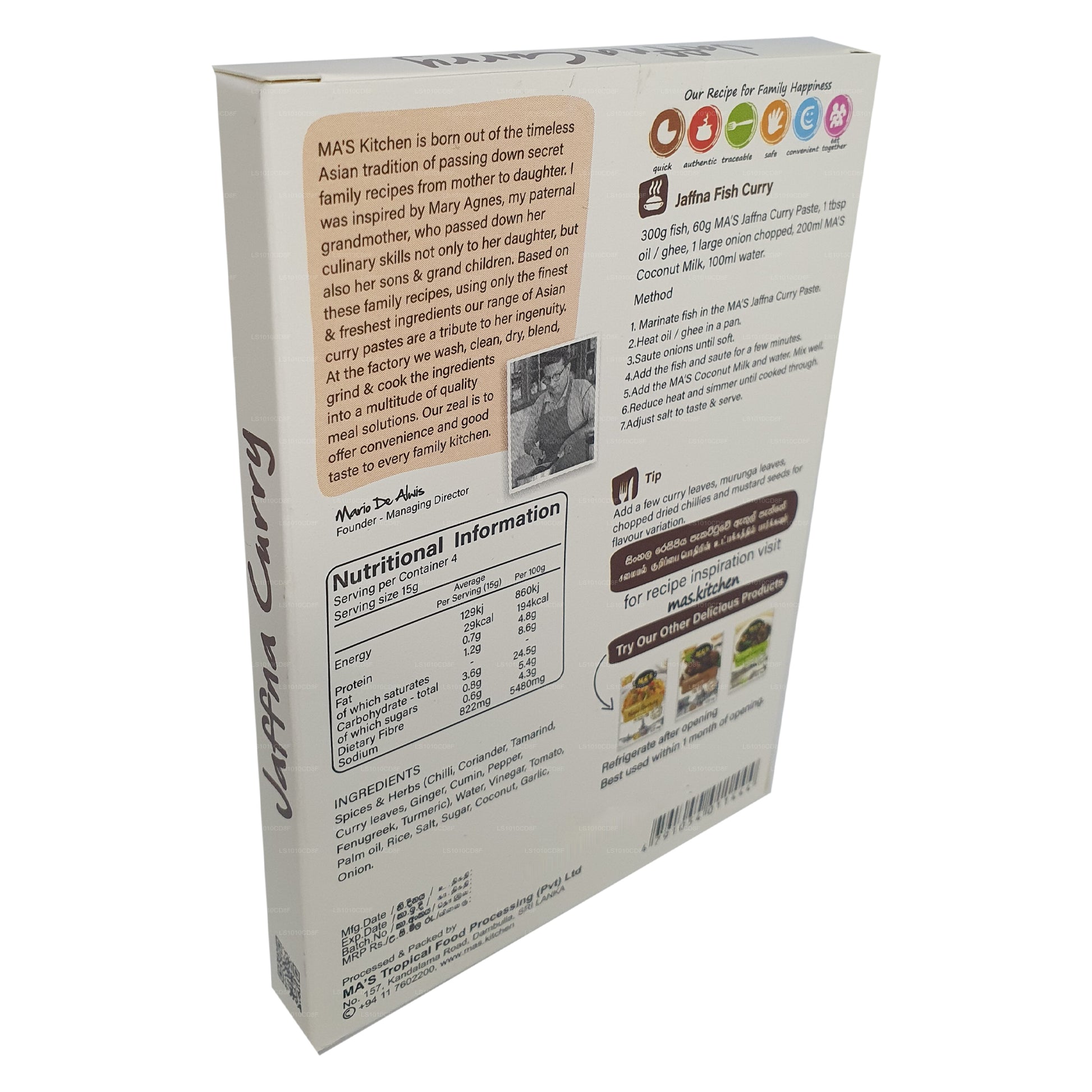 MA's Kitchen Jaffna Curry Paste (60g) is a convenient blend of authentic flavors inspired by northern Sri Lanka's Jaffna cuisine. This expertly crafted paste combines roasted spices, coconut, and traditional ingredients for a mouthwatering curry base. Versatile and preservative-free, it's perfect for a variety of dishes, from chicken curry to vegetarian options. Save time in the kitchen and savor the rich taste of Jaffna with MA's Kitchen Jaffna Curry Paste.