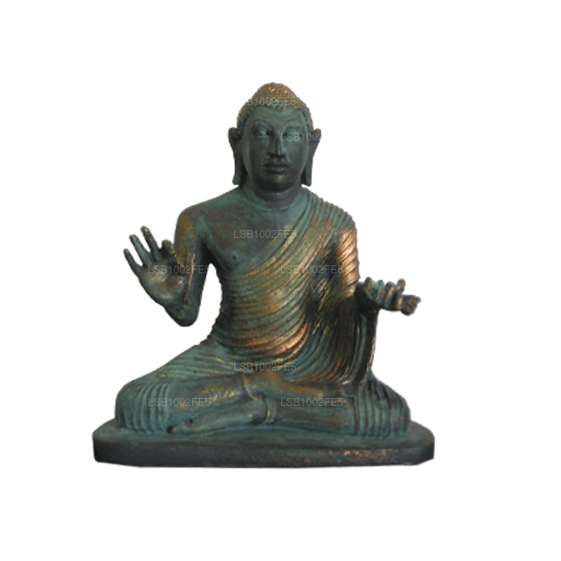 This statue was found near Badulla in Sri Lanka, and it is presently being exhibited in the Colombo National Museum. Researchers have determined that this hollow cast Buddha figure made out of bronze is 54.5 cm in height and dates back to around the 6th century A.D. The statue of Buddha depicts an expression of preaching or teaching dhamma since it is seated in the Virasana posture. The right hand represents the Vitarka Mudra, which is held in a slightly higher position (argumentation gesture). The left hand assumes the Katakahastha position as it holds the robe's gathered pleats. The Buddha is shown to be focused throughout his preaching by maintaining an erect posture and having wide-open eyes.
