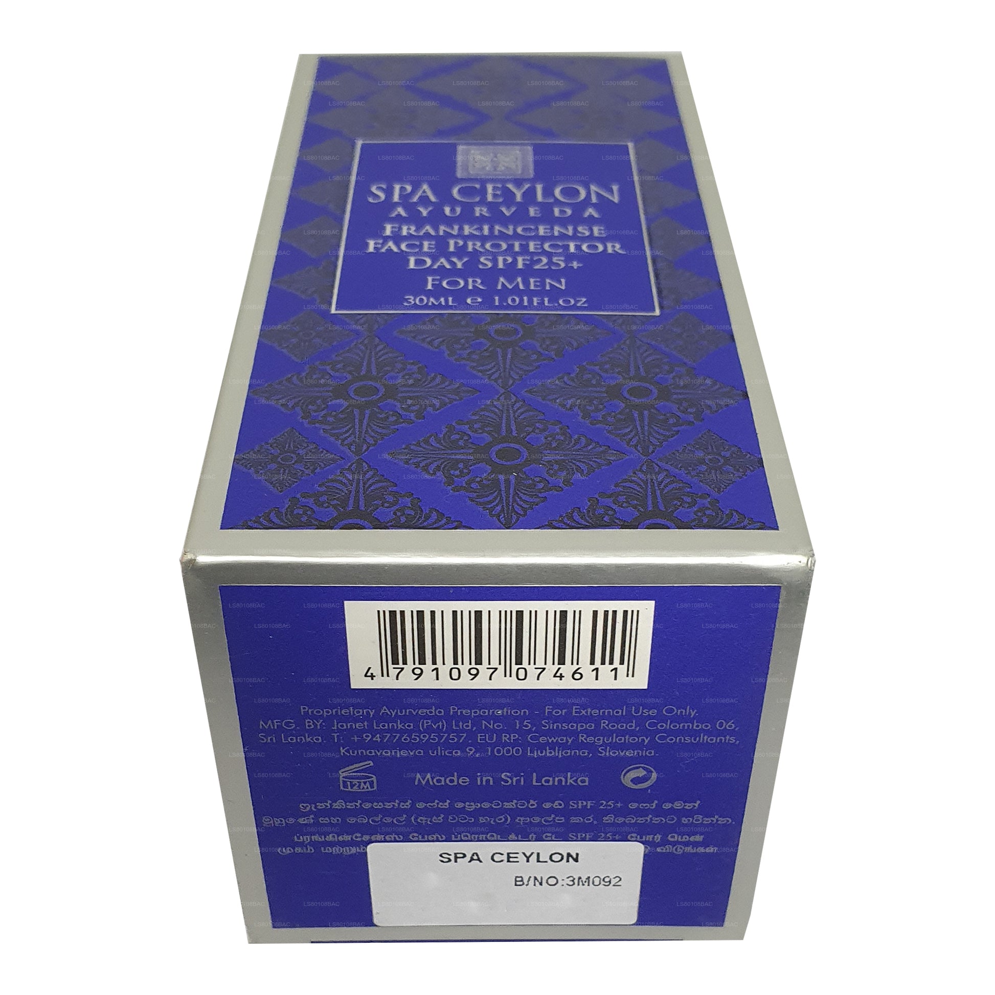 (SKU: LS80108BAC) The Spa Ceylon Frankincense Rituals For Men Face Protector Day je 30ml produkt péče o pleť speciálně navržený pro muže. Nabízí ochranu SPF 25+ proti UVA a UVB paprskům, zvlhčuje pokožku, snižuje výskyt jemných linek a vrásek, zklidňuje podráždění extraktem z kadidla a má lehkou nemastnou recepturu pro pohodlné každodenní použití