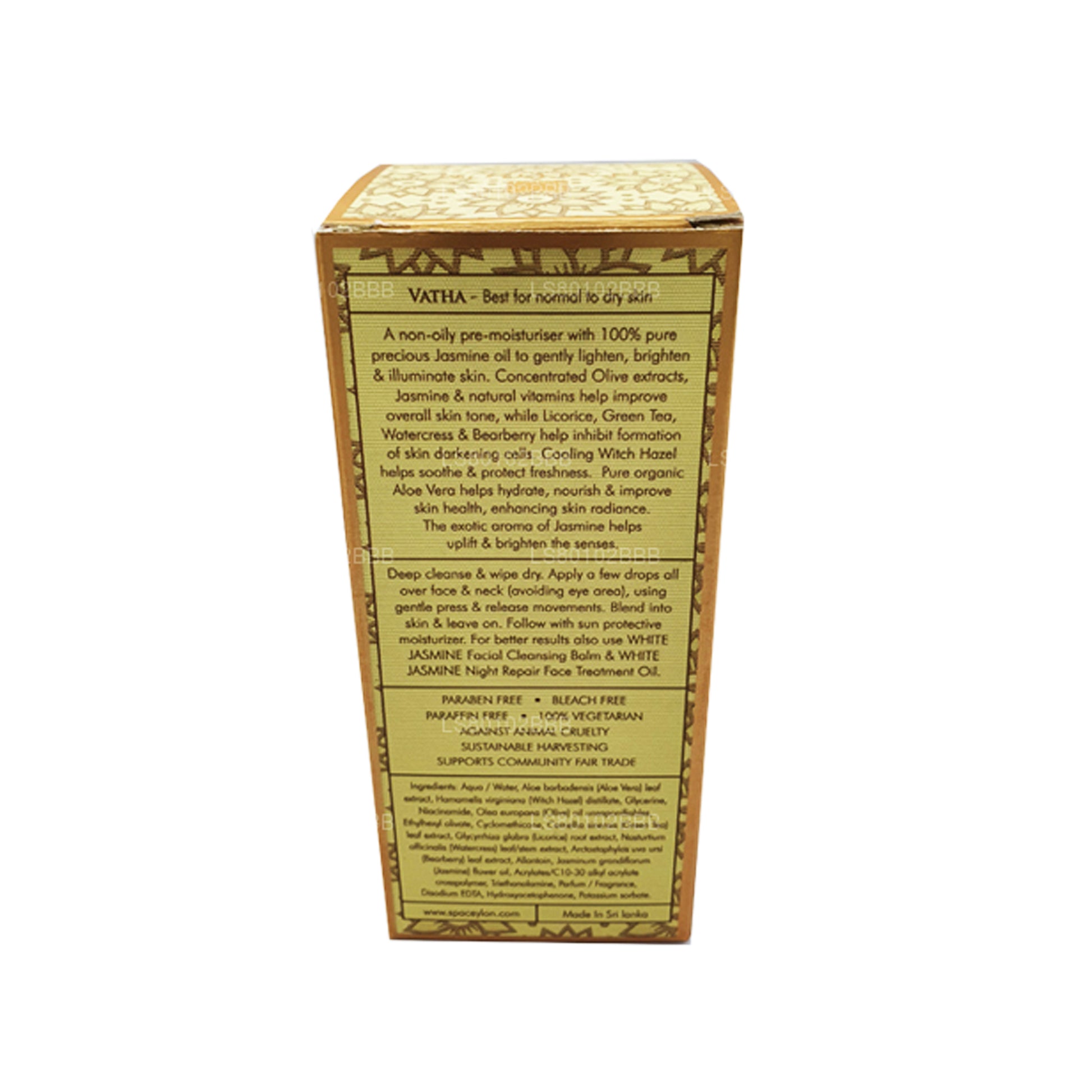 (SKU: LKZ0910139) A non-oily pre-moisturiser with 100% pure precious Jasmine oil to gently brighten & illuminate skin. Concentrated Olive extracts, Jasmine & natural vitamins help improve overall skin tone, while Licorice, Green Tea, Watercress & Bearberry help inhibit formation of skin darkening cells. Cooling Witch Hazel helps soothe & protect freshness. Pure organic Aloe Vera helps hydrate, nourish & improve skin health, enhancing skin radiance. The exotic aroma of Jasmine helps uplift & brighten the senses.
