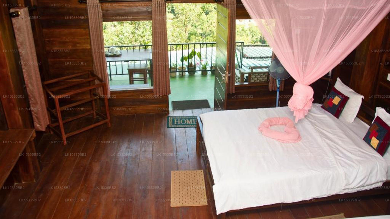 The cabin features warm wooden interiors with comfortable furnishings. Each unit includes cozy bedding, private bathrooms, and balconies offering breathtaking views of Ella’s landscapes.