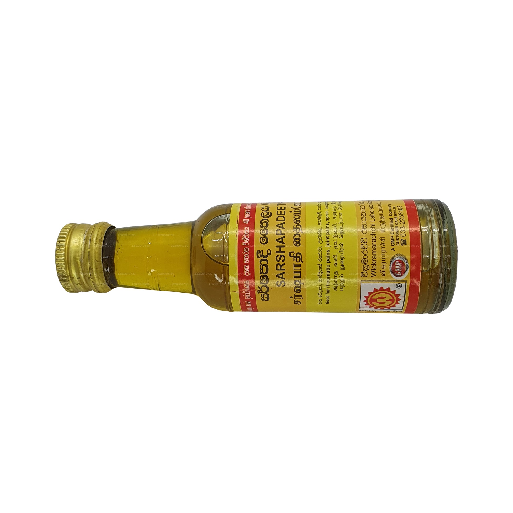 (SKU: LS40005D57) Wickramarachchi Labs Sarshapadi Thailaya je tradiční ajurvédský léčivý olej se základem hořčičného oleje naplněného různými bylinami a botanickými extrakty. Je navržen tak, aby poskytoval úlevu od stavů, jako je astma, pneumonie a otoky způsobené nehodami nebo revmatickými potížemi. Olej se aplikuje lokálně a může pomoci při dýchacích potížích, snížit zánět a podpořit celkovou pohodu